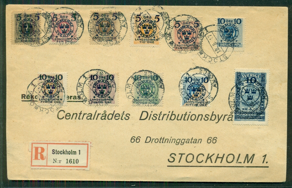 411Y | 1916, Complete semi-postal set (B11-21) on registered cover with Stockholm cancel, quite scarce and a great exhibit piece, Scott $996.00 for stamps alone and on cover approx 2x, VF, $675.00 | |