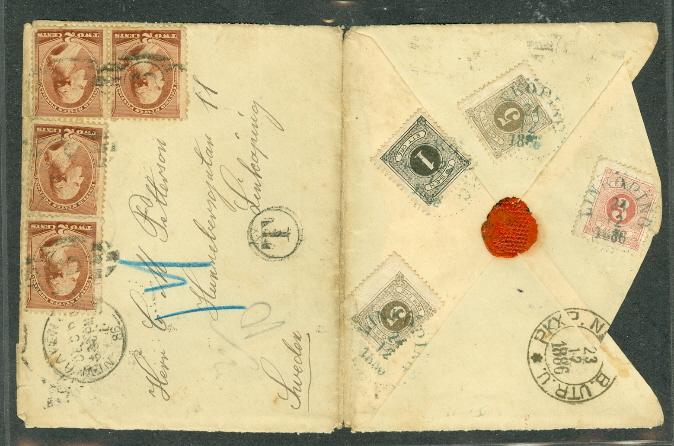 411AF | U.S. 1886 2¢ (x4) tied on cover to Sweden w/3 diff vals Postage Dues, applied on arrival (total 14ore), nice item opened for exhibit, $230.00 | |