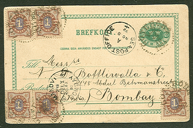 1892, Multifranked 5ore postal card to Bombay INDIA with rare SEA POST OFFICE strike on front, neat item, $575.00 |
