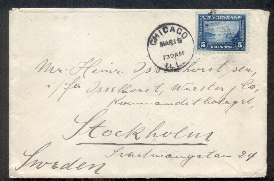 | 411W | 1915, Chicago to SWEDEN cover franked w/#403, arrival bkstp reverse, nice item, $125.00 | ||