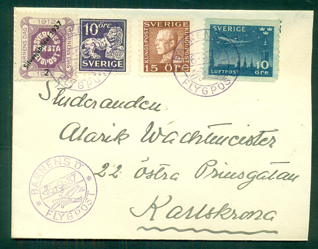 415E | 1937, Jubilee Flight w/3kr Ovpt (Facit HF2) tied with others and proper cancel, VF, Facit 400kr, $32.00 | |