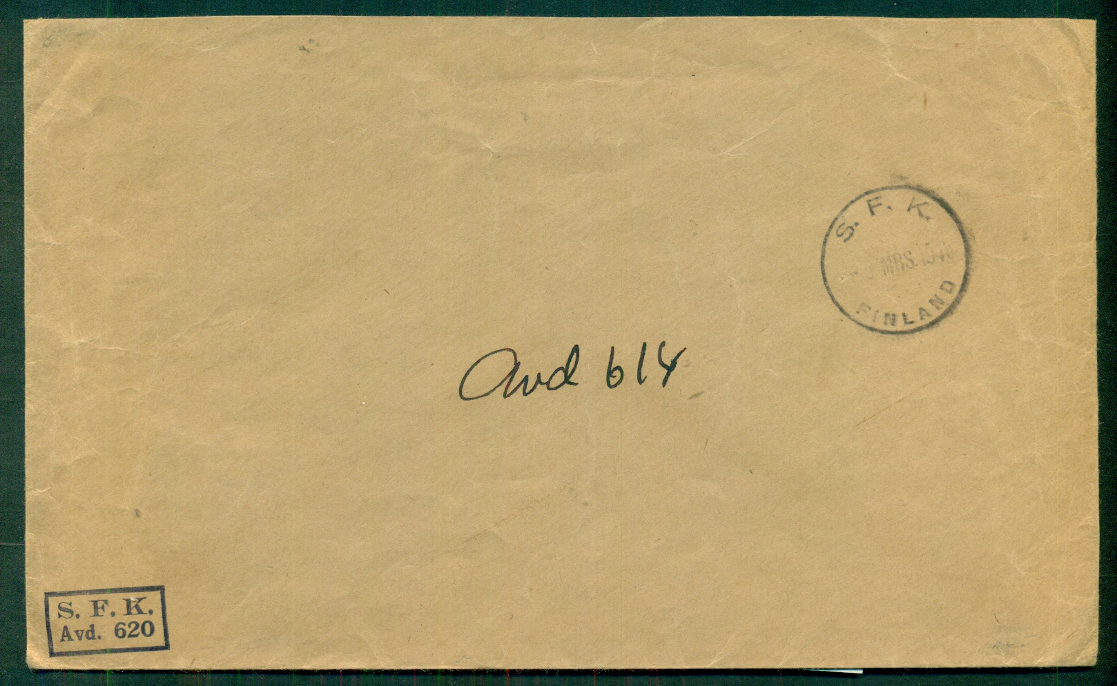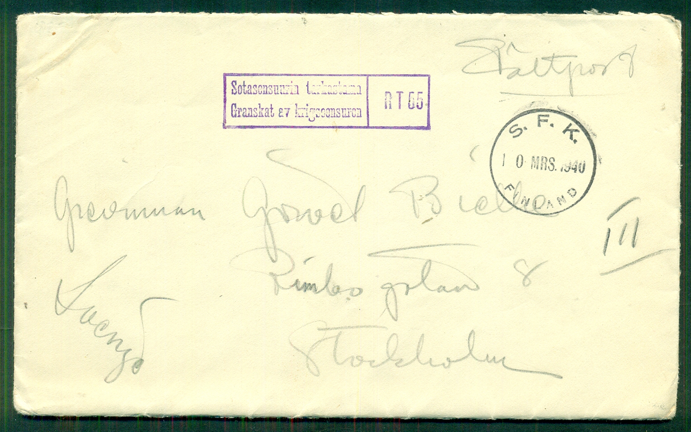 | 415GC | 1940, Sweden Volunteer Forces in Finland cover to Sweden, rare S.F.K. DEPA (R5) and S.F.K. KARSTAB (R4) + censors, rare and scarce WWII cover, $250.00 | ||