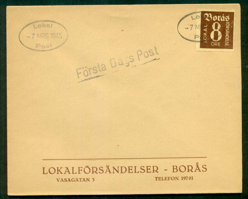 415KC | 1945 Sweden Locals, BORAS, 8ore tied on FDC, VF, $10.00 | |