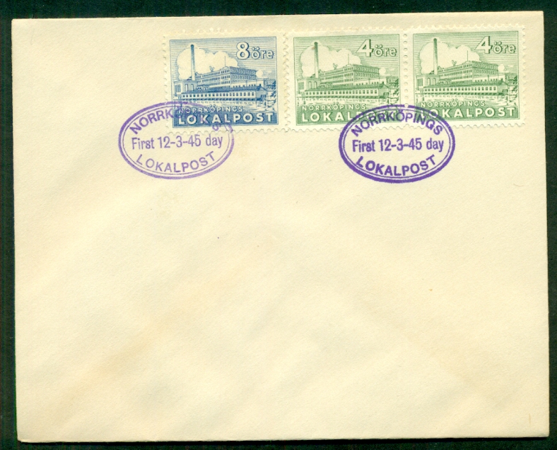 415KH | 1945 Sweden Locals, NORRKOPINGS, 4ore pair + 8ore tied on FDC, VF, $10.00 | |