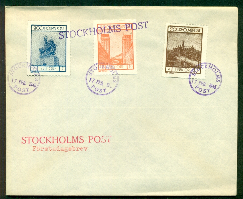 415KM | 1945 Sweden Locals, STOCKHOLM, 4ore, 7ore & 10ore tied on FDC, VF, $18.00 |