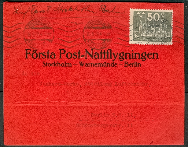 414 | 1924, First Night Flight to Berlin, 50ore tied on deep red envelope, nice item, $100.00 | |
