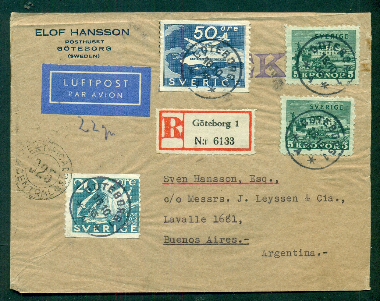 | 415C | 1936, Air/regis cover to ARGENTINA w/high val franking – 5kr x2 + 50ore + 20ore, scarcer and VF, $250.00 | ||