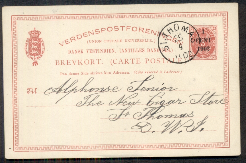 surcharge on 3’ card, used Frederiksted 1902, proper local use w/message,