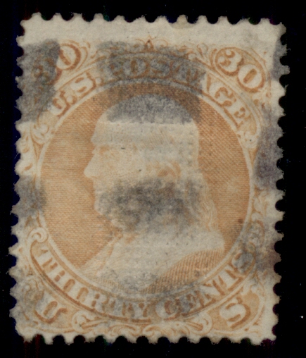 30¢ orange, “F” Grill, used, tiny perf stain LR otherwise VF, Miller certificate, scarce stamp, Scott $950.00, $360.00 |