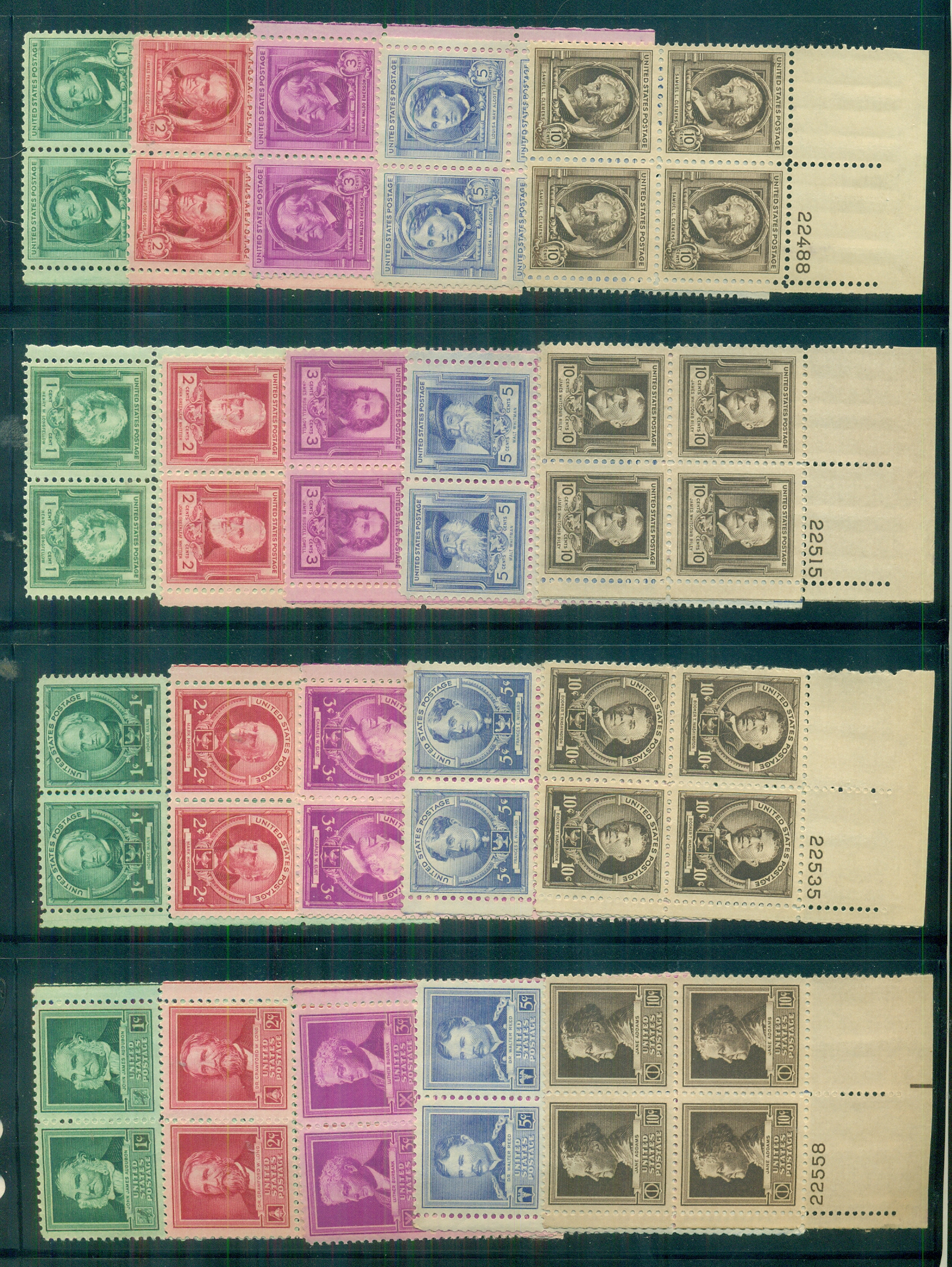 Famous Americans set, Complete, Plate No. Blocks of 4, og, NH, VF, Scott $265.70, one sample page shown, 7 total in group, $135.00 |