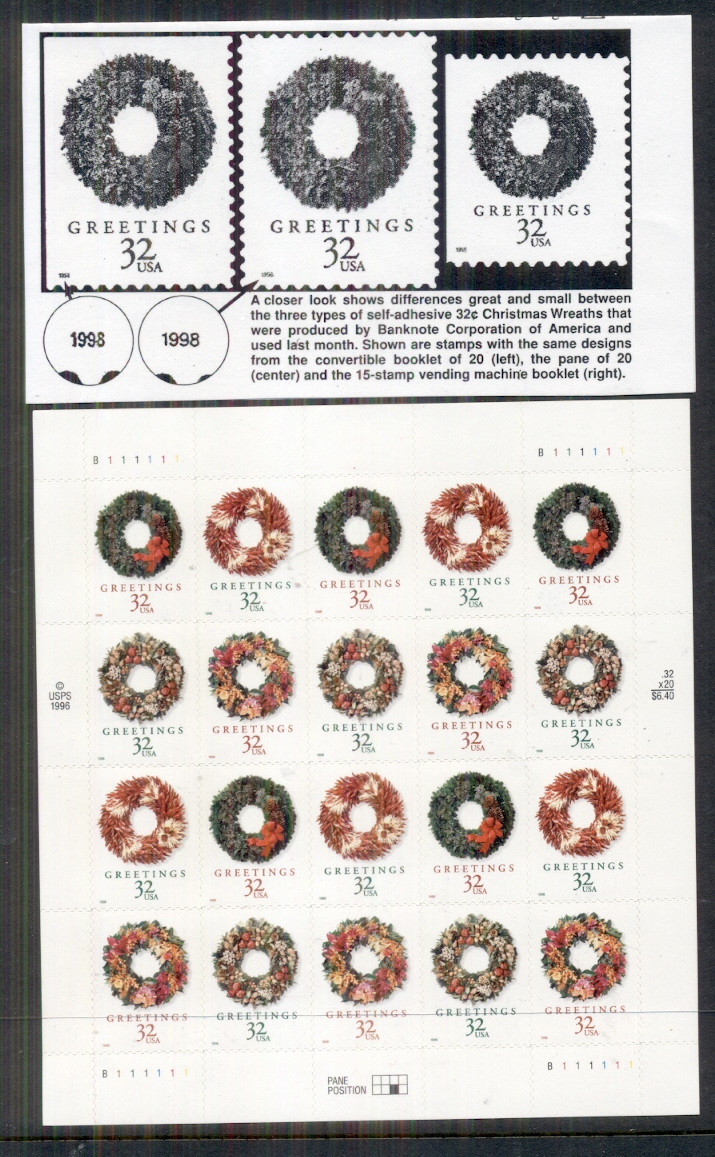 32¢ Christmas Wreaths, Pane of 20 and Booklet Pane of 20, Die Cut varieties, NH, VF, Scott $65.00, $39.00 |