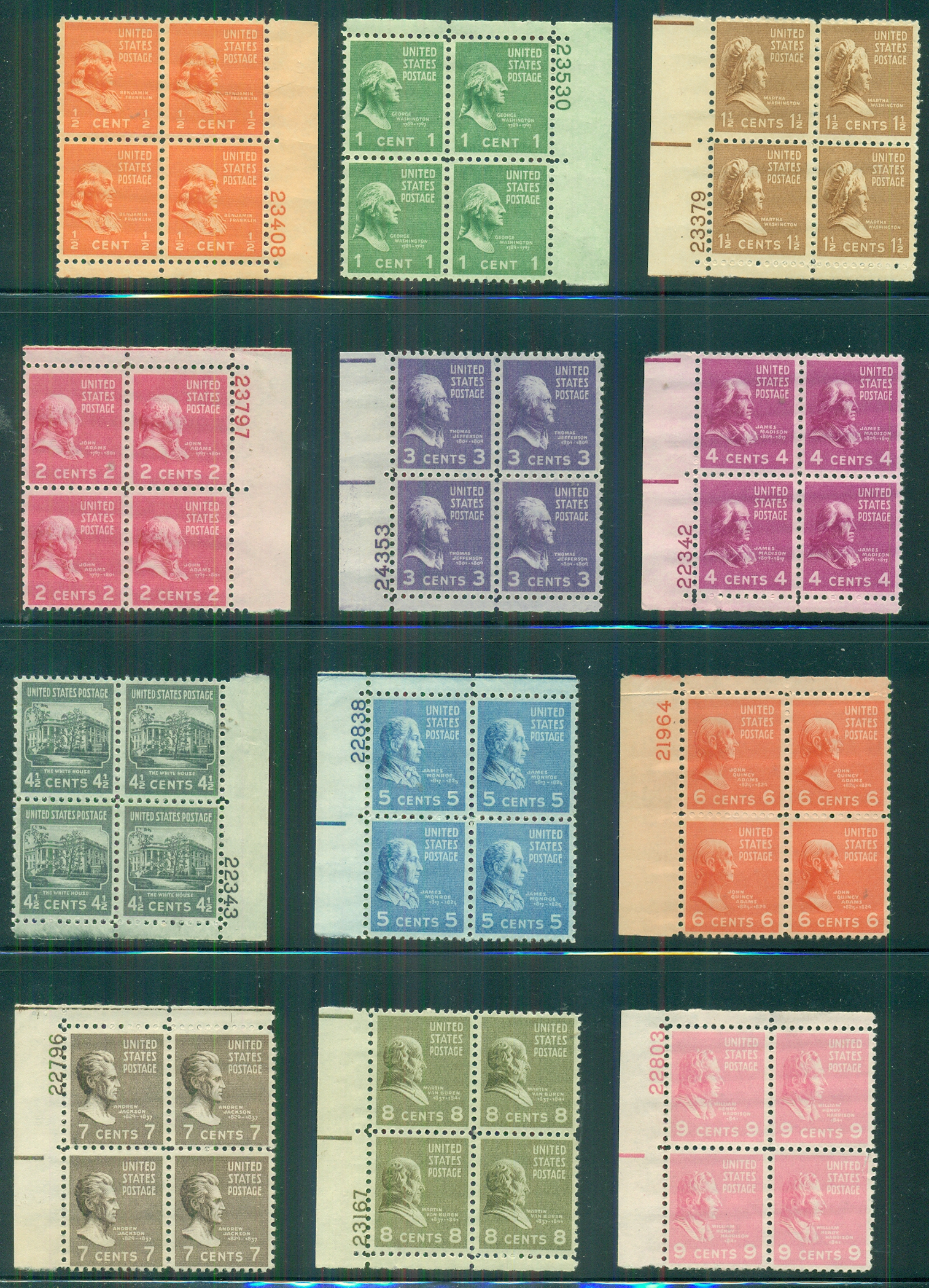 ½ ¢ - $5.00 Complete Prexie set in Plate No. Blocks of 4, NH, VF, Scott $670.95, $325.00 |