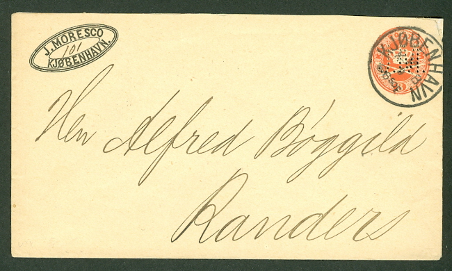 19th Century, 8ore postal envelope with PERFIN J.M. (J. Moresco) and tied Kjobenhavn, perfins on postal stationery are quite unusual, $100.00 |