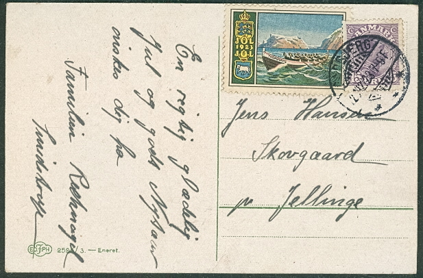 1907, ESPE Star Cancel ties 5ore W/Christmas seal on postcard, VF, $22.00 |