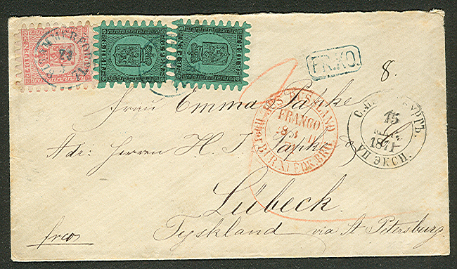 1865, Folded Letter from Bjornborg Finland via St. Petersburg w/bold red AUS RUSSLAND Railway postmark to Carlshutte in Holstein, VF, $210.00 |