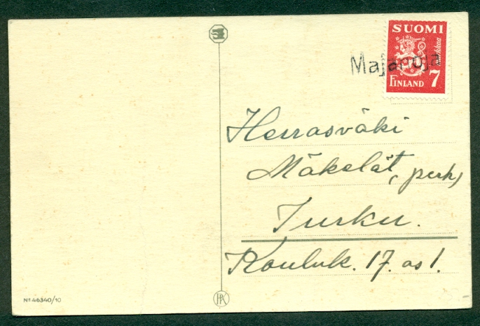 Village cancel MAJANOJA ties 7mk on postcard, VF, $20.00 |