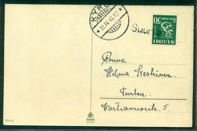 Village cancel SUURILA ties 50p to postcard, VF, $20.00 |