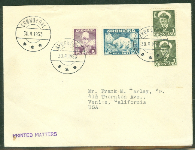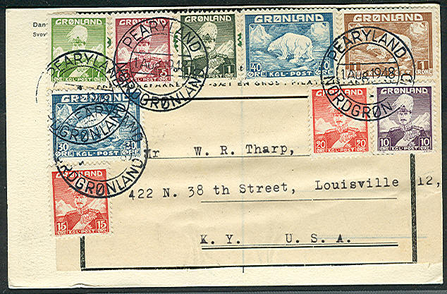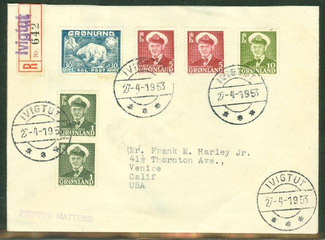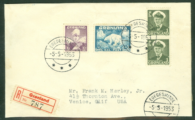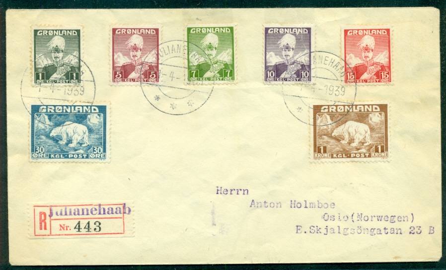 1939, Commercial registered cover to U.S. with complete 1st issue tied Julianhaab, VF, Facit $120.00+, $85.00 |