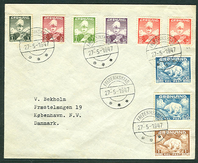 1950, Complete 1st Issue set tied Julianehaab on registered cover, unusual as parts of set were issued in 1938 and 1946, VF, $49.00 |