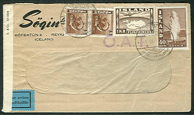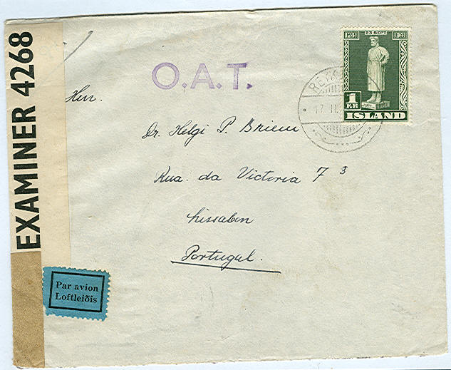 1943, scarce O.A.T. (in purple) cover Reykjavik to