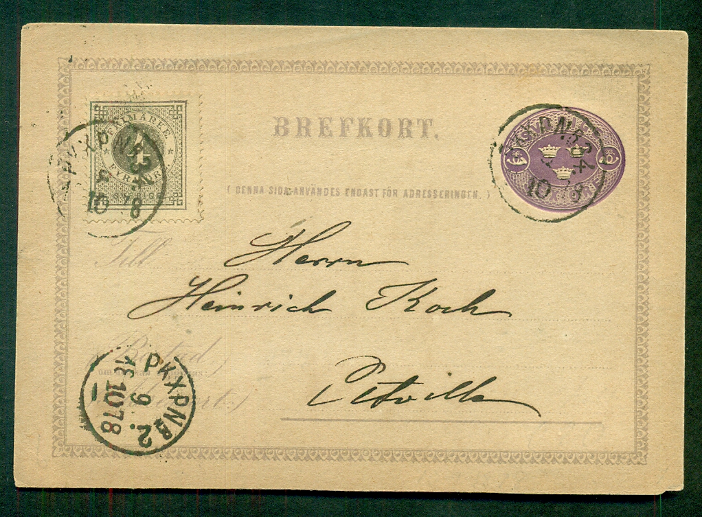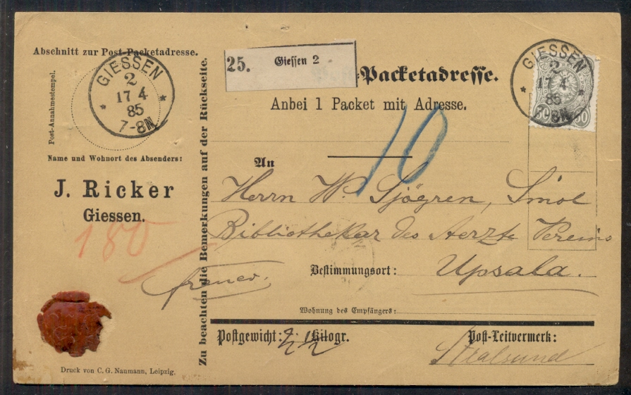 | 411AE | 1885, Sweden Postage Dues on Germany parcel card from Giessen to Upsala, very pretty multiple franking, VF, $225.00 | ||