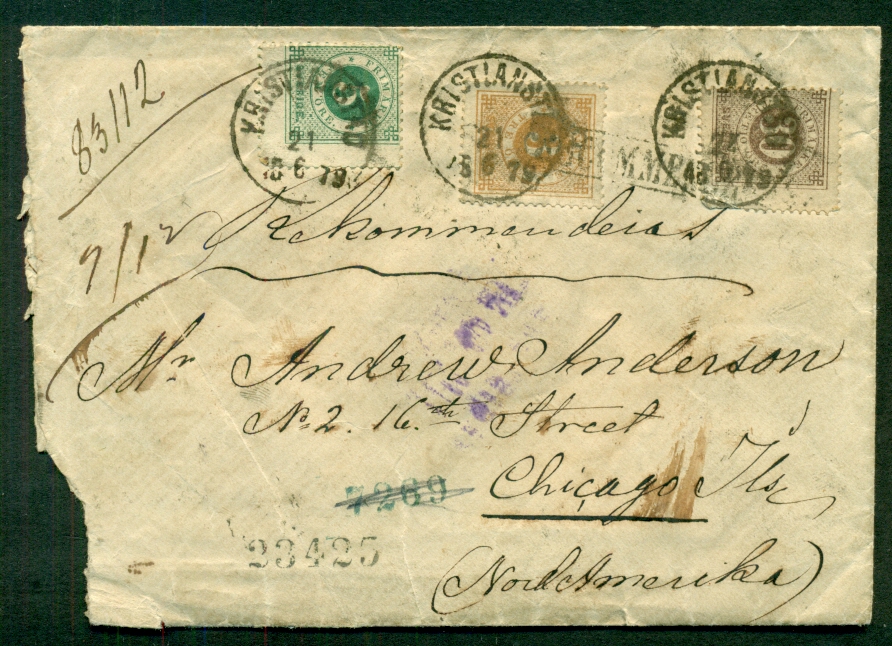 | 411ADA | 1879, Immigrant Mail turned cover made from previously received cover, franked w/30ore, 5ore+3ore = 380 registered rate, rough opening at left, five red wax seals and purple registry stamp reverse, $350.00 | ||