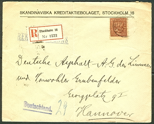 412C | 1922, 70ore single franking tied on registered cover to Germany (bkstp), Facit $112.00, $45.00 | |
