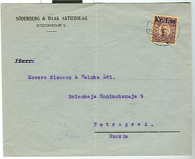 1918, 1.98kr Ovpt tied by Paket cancel on cover to RUSSIA, very scarce usage, 1.98ore was the address card rate for accompanying parcels to Russia, Facit $4,000.00, $1,950.00 |
