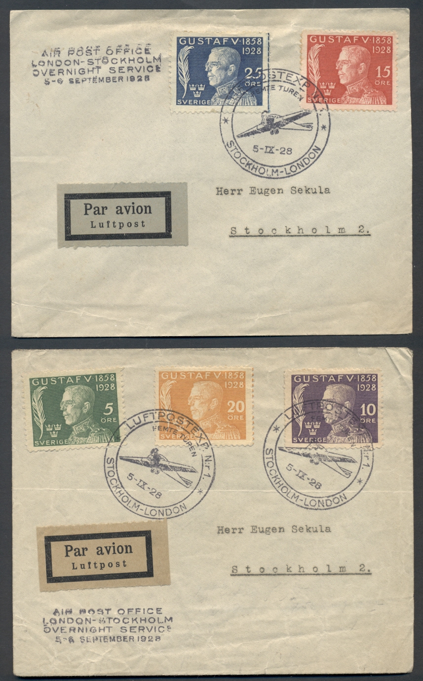 414F | 1928, Complete Gustav set on 2 overnight flight covers, $25.00 | |