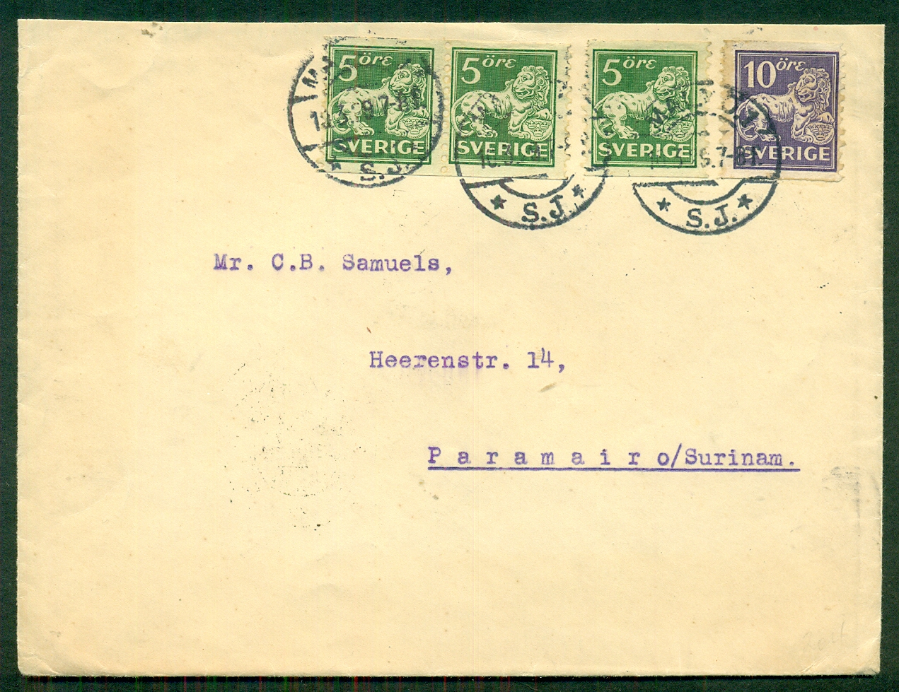 | 414K | 1929, multi-franked to SURINAM – rare destination – 1 known per Facit, signed Pollak, VF, $200.00 | ||