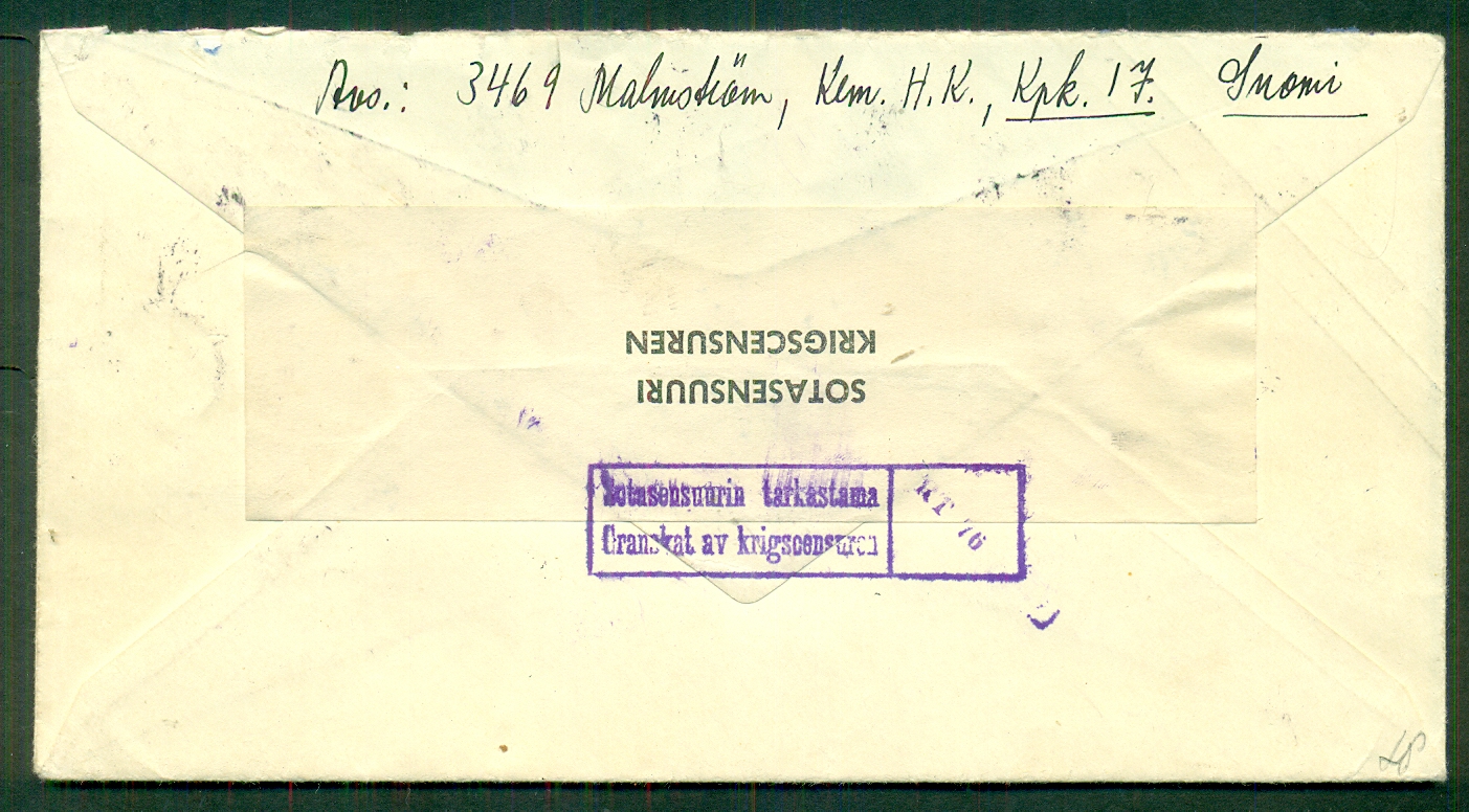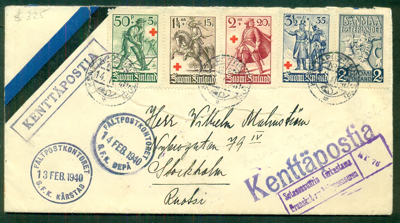 | 415GC | 1940, Sweden Volunteer Forces in Finland cover to Sweden, rare S.F.K. DEPA (R5) and S.F.K. KARSTAB (R4) + censors, rare and scarce WWII cover, $250.00 | ||
