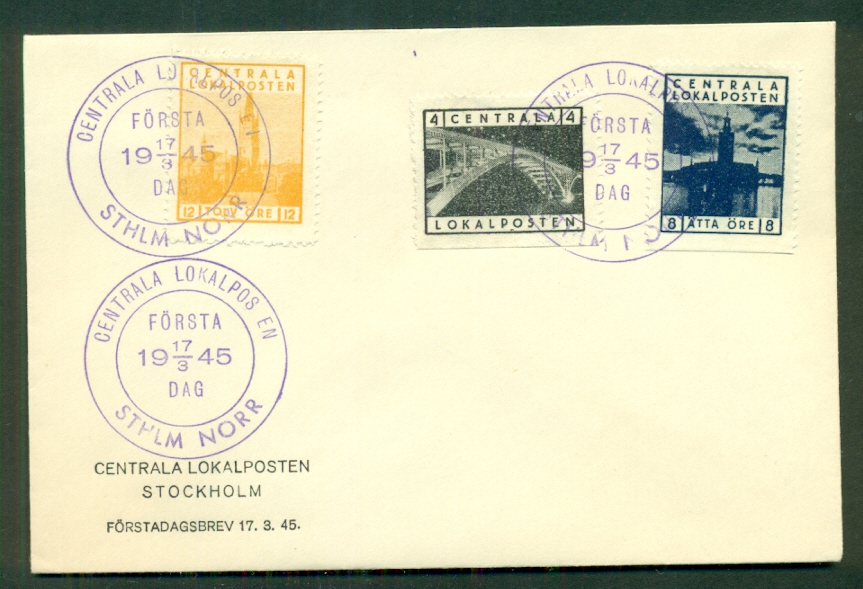 415KE | 1945 Sweden Locals, CENTRALA, 4ore + 8ore + 12ore tied on FDC, VF, $15.00 | |