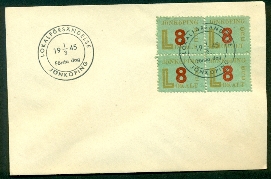 415KF | 1945 Sweden Locals, JONKOPING, 8ore block of 4 tied on FDC, VF, $10.00 | |