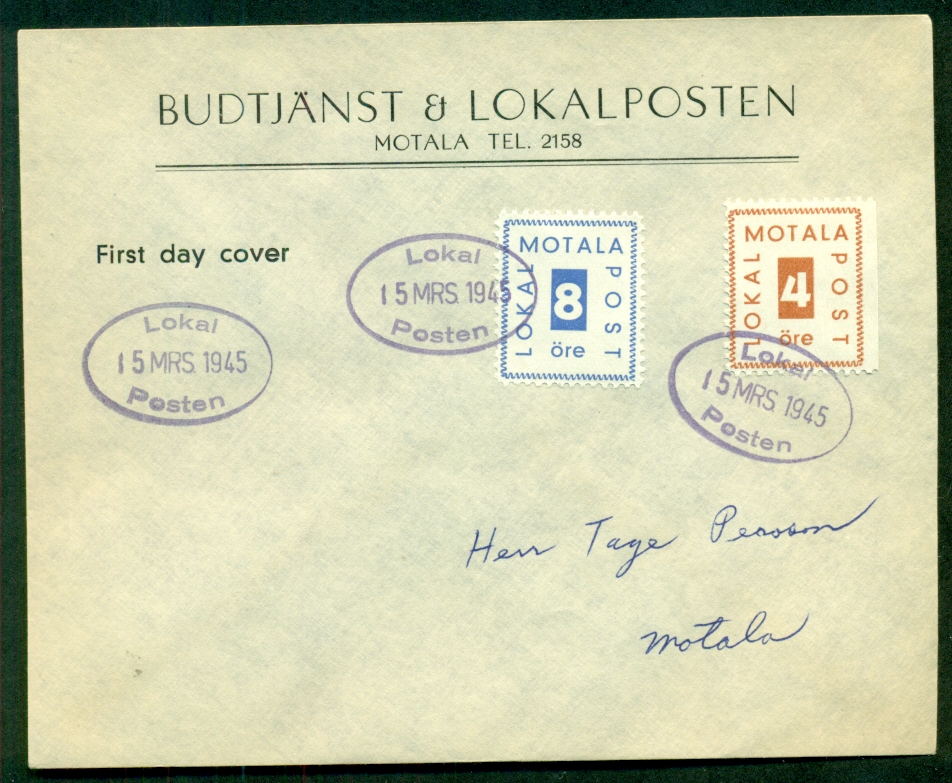 415KG | 1945 Sweden Locals, MOTALA, 4ore + 8ore tied on FDC, VF, $13.00 |
