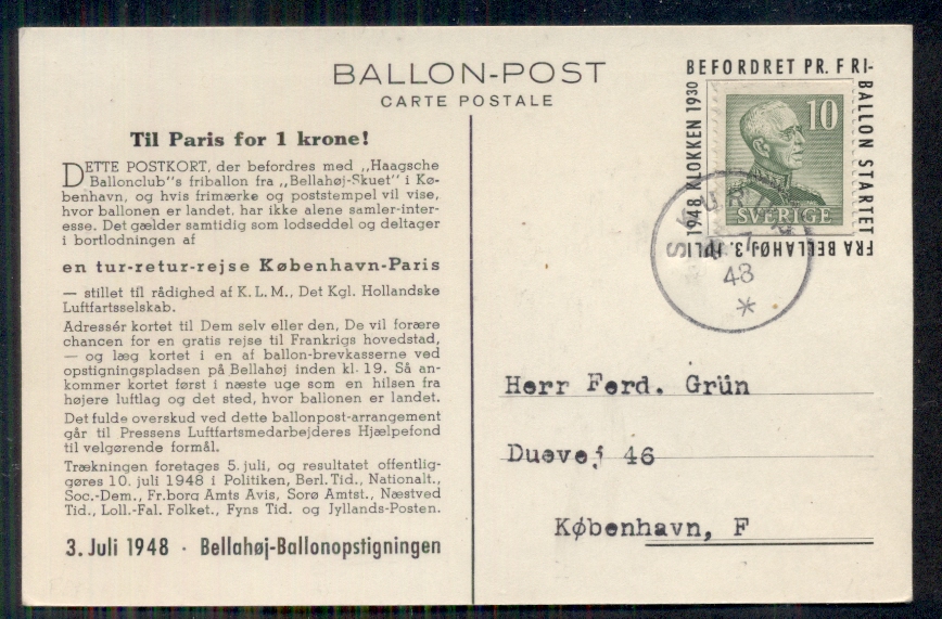 | 415KP | 1948, Sweden BALLOON – POST Official card to Denmark, VF, $24.00 | ||