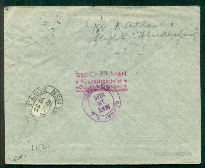 415A | 1936 Hindenburg North America flight, proper handstamp and cachet, VF, $170.00 | |