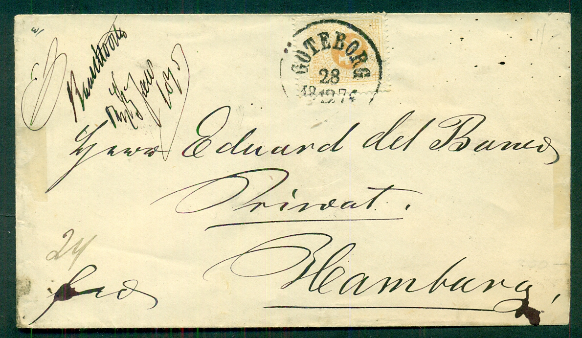 | 410Y | 1874, 24ore single franking tied Goteborg on cover to Germany, VF, $100.00 | ||