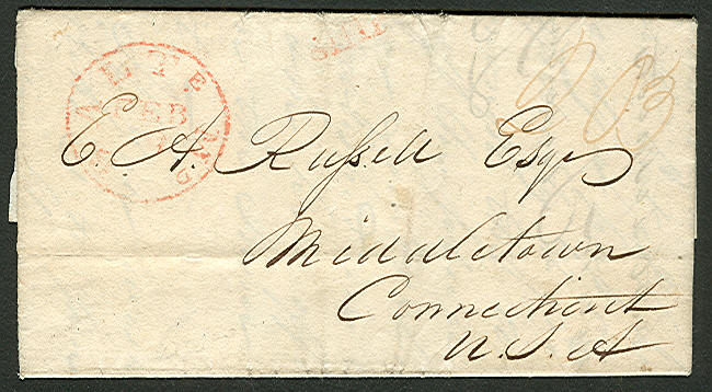 1829, ST. BARTHELMY (Swedish West Indies) to Middletown, CT, beautiful and scarce folded letter w/red Ship and Baltimore, MD. Transit strikes on front, $1,300.00 |